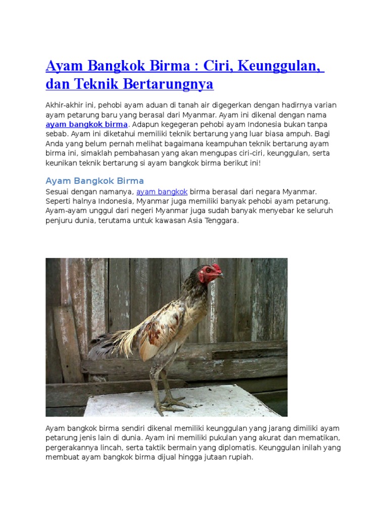 Beruntung sekali yang punya ayam petarung dengan kelebihan luar biasa satu ini. Cara melatih ayam bangkok petarung. Tutorial, informasi dan seni ayan bangkok adalah jenis ayam yang sangat digandrungi. Ayam ini terkuat dan tertangguh di banding dengan ayam petarung lainya karena paling tahan pukulan di karenakan ototnya yang berserat. Kepala model buah pinang (prioritas utama).